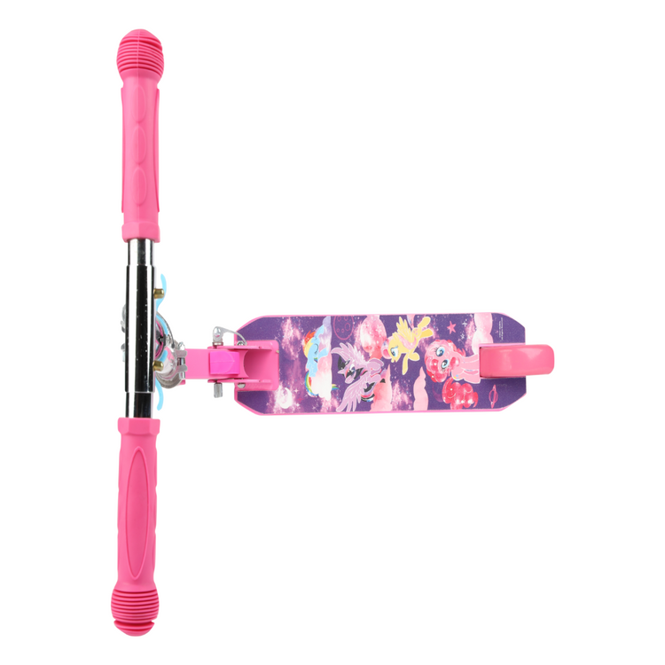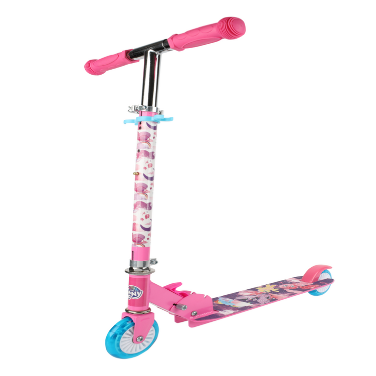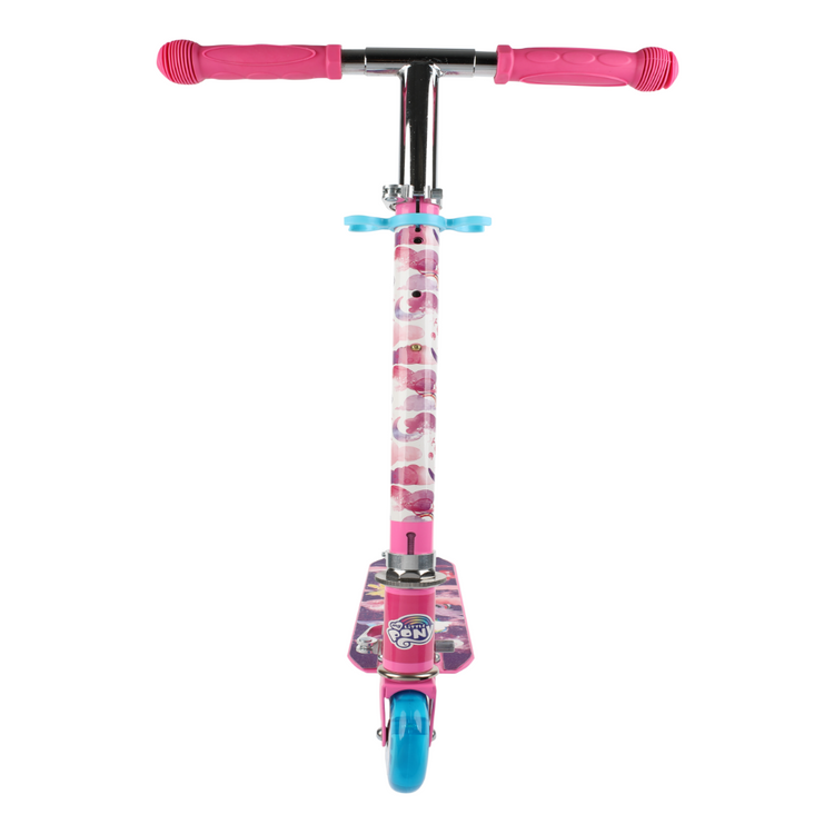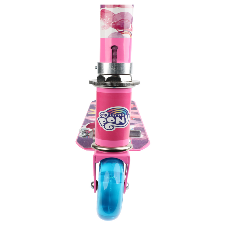 Put on your helmet, kick off and go have fun! My Little Pony Light Up Wheel Scooter is perfect for tons of outdoor fun adventures. This kick scooter is made out of a strong, light metal deck to keep it lightweight and sturdy for everyday use. It easily folds to a compact size that can fit in cars, trucks, or closets. With rubber grips for a comfortable grasp and a quick stop rear brake as an added layer of safety for those quick decisions.