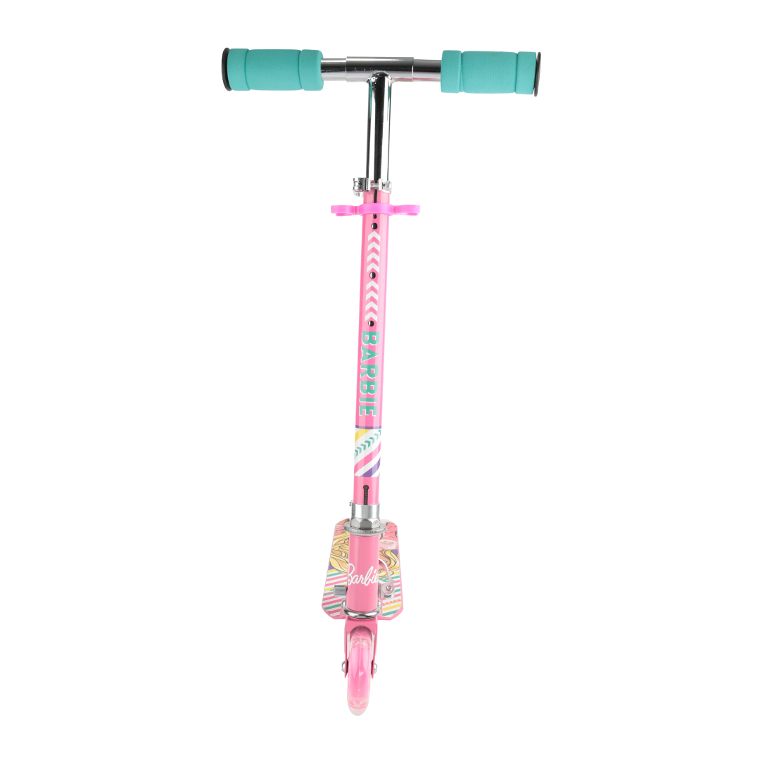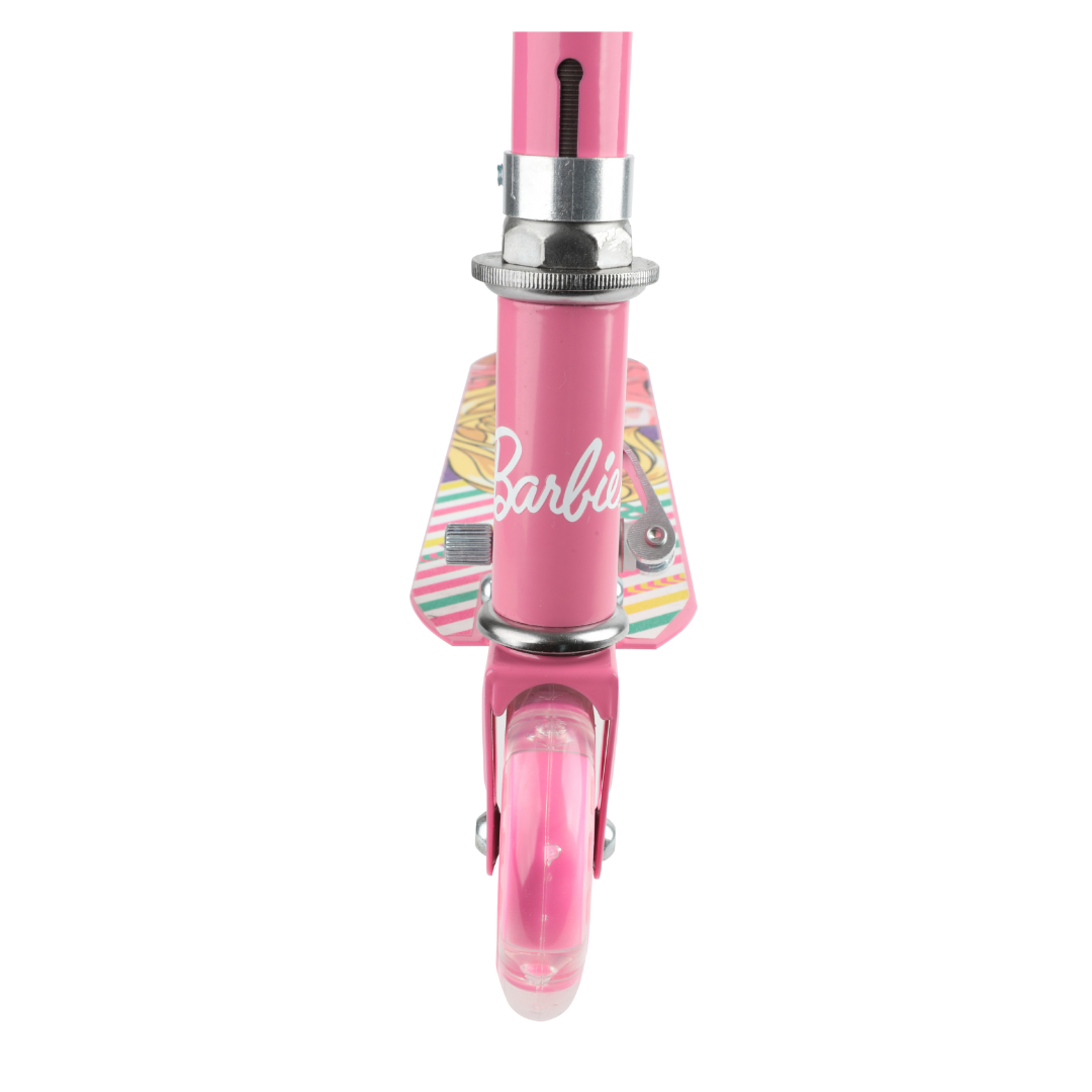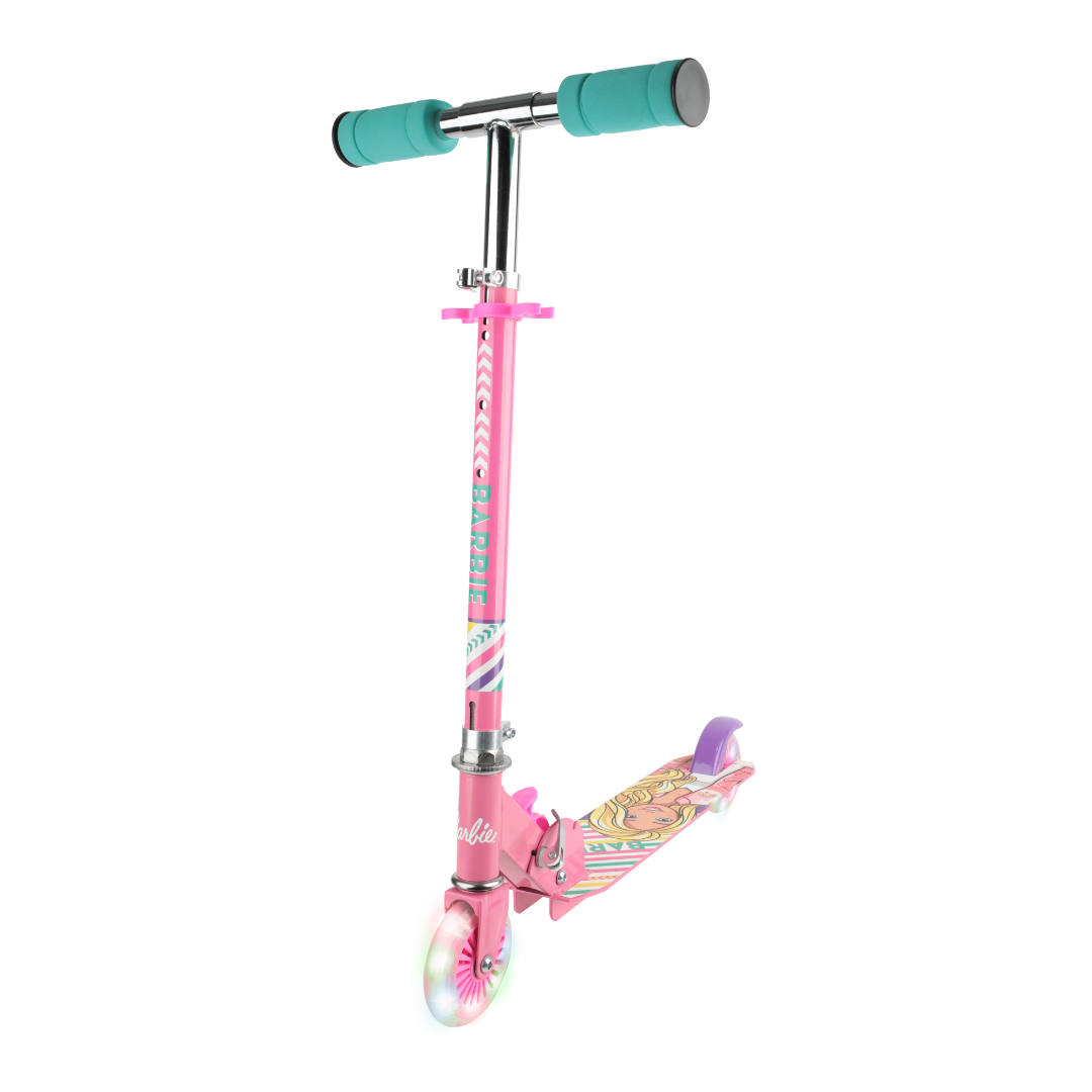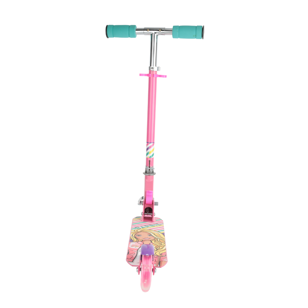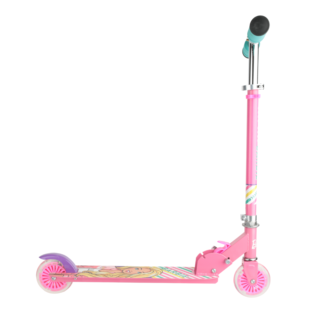 Put on your helmet, kick off and go have fun! Barbie Light Up Wheels Scooter is perfect for tons of outdoor fun adventures. This kick scooter is made out of a strong, light metal deck to keep it lightweight and sturdy for everyday use. It easily folds to a compact size that can fit in cars, trucks, or closets. With rubber grips for a comfortable grasp and a quick stop rear brake as an added layer of safety for those quick decisions.