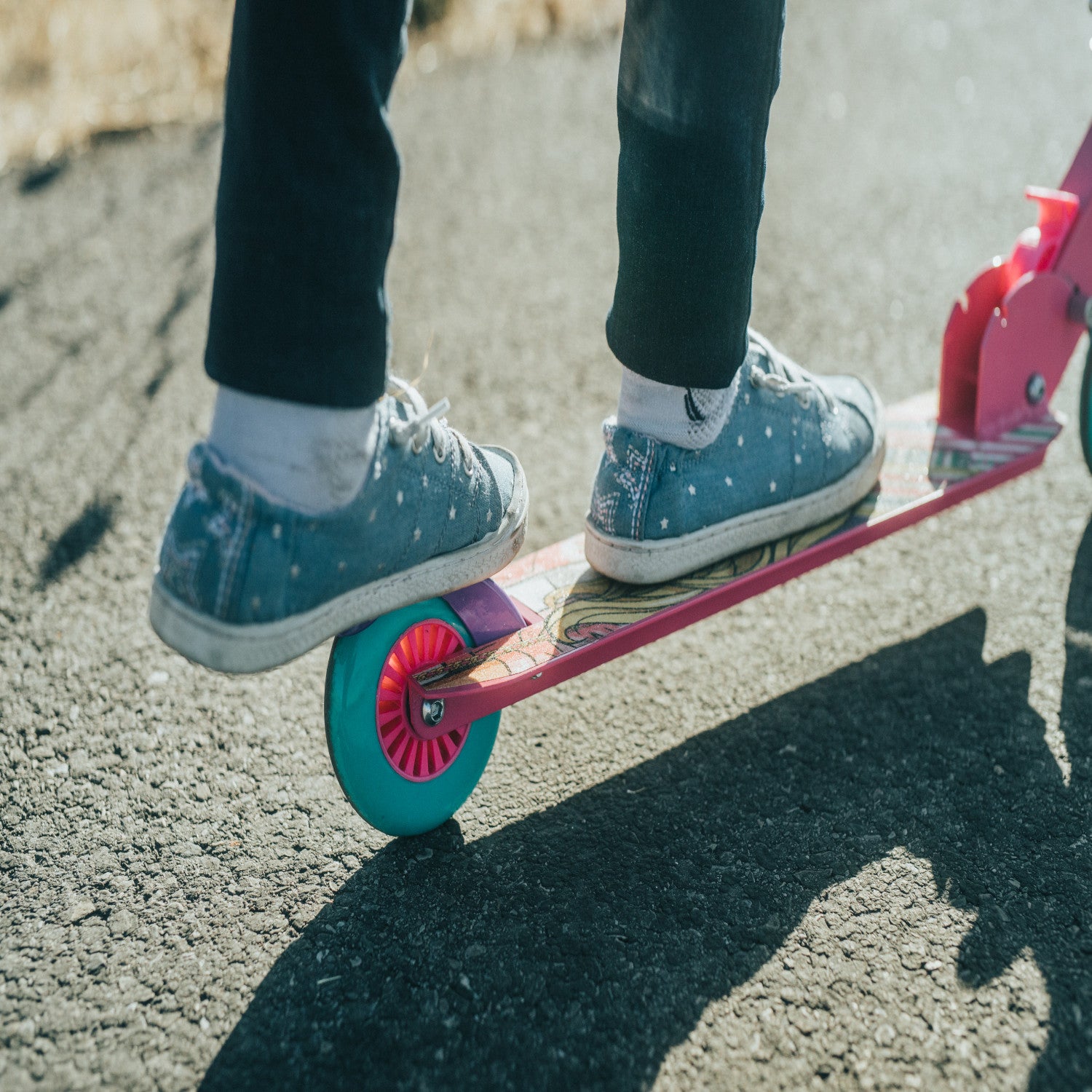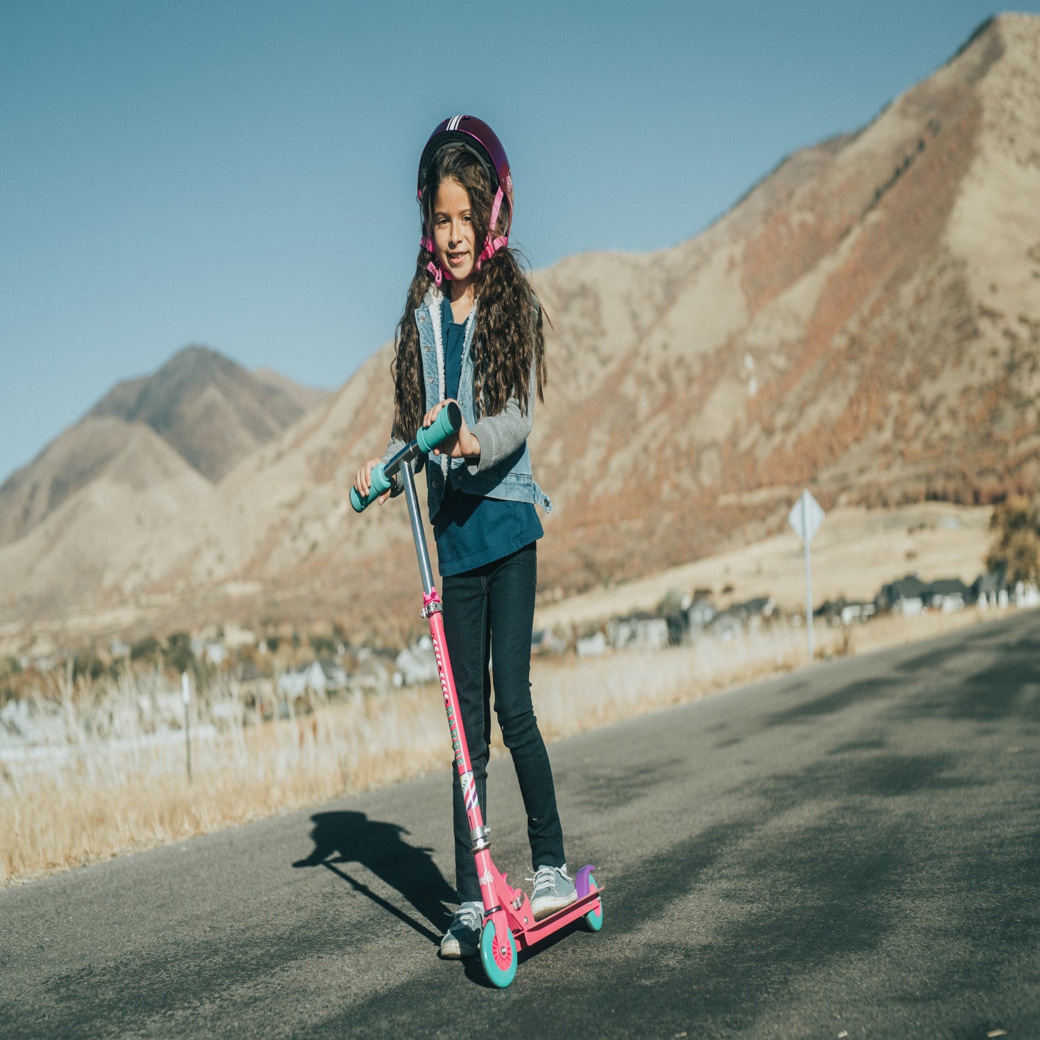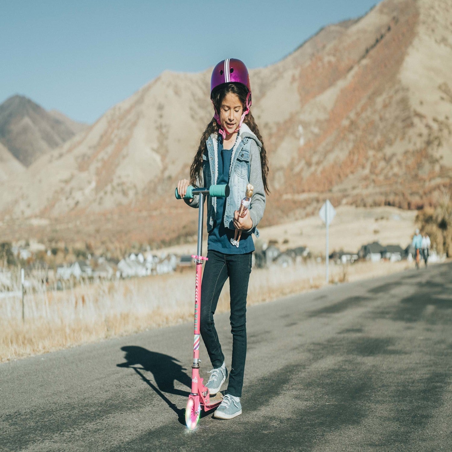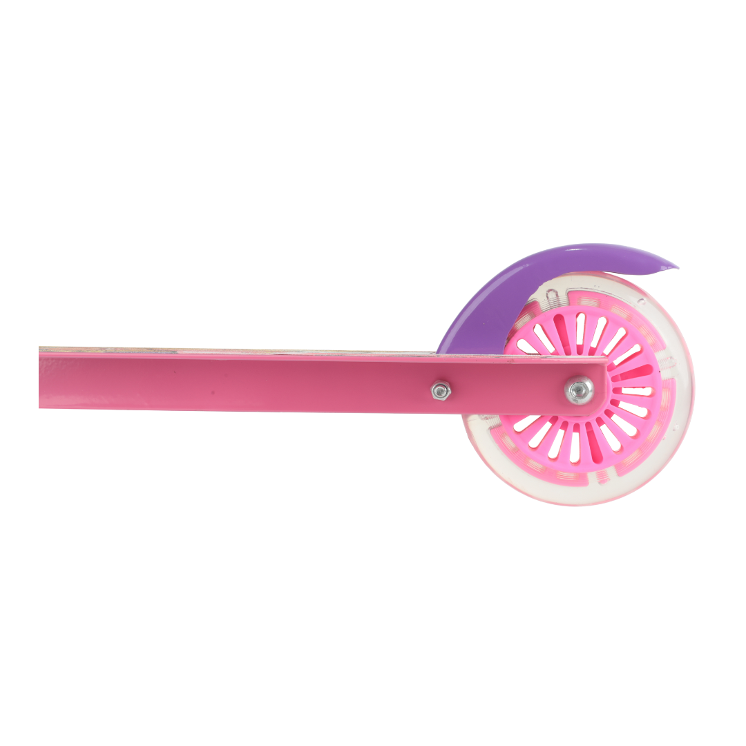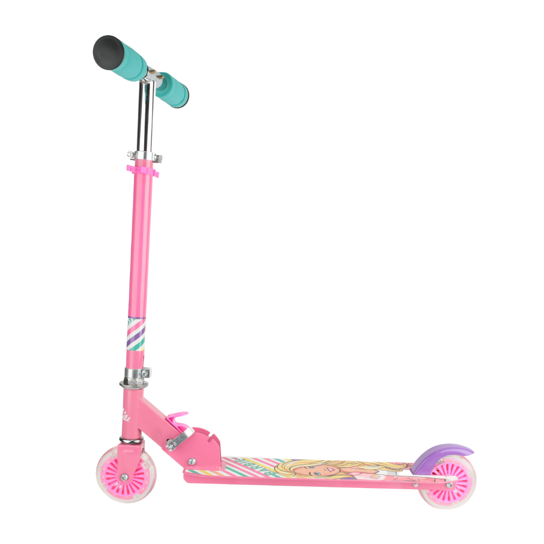 Put on your helmet, kick off and go have fun! Barbie Light Up Wheels Scooter is perfect for tons of outdoor fun adventures. This kick scooter is made out of a strong, light metal deck to keep it lightweight and sturdy for everyday use. It easily folds to a compact size that can fit in cars, trucks, or closets. With rubber grips for a comfortable grasp and a quick stop rear brake as an added layer of safety for those quick decisions.
