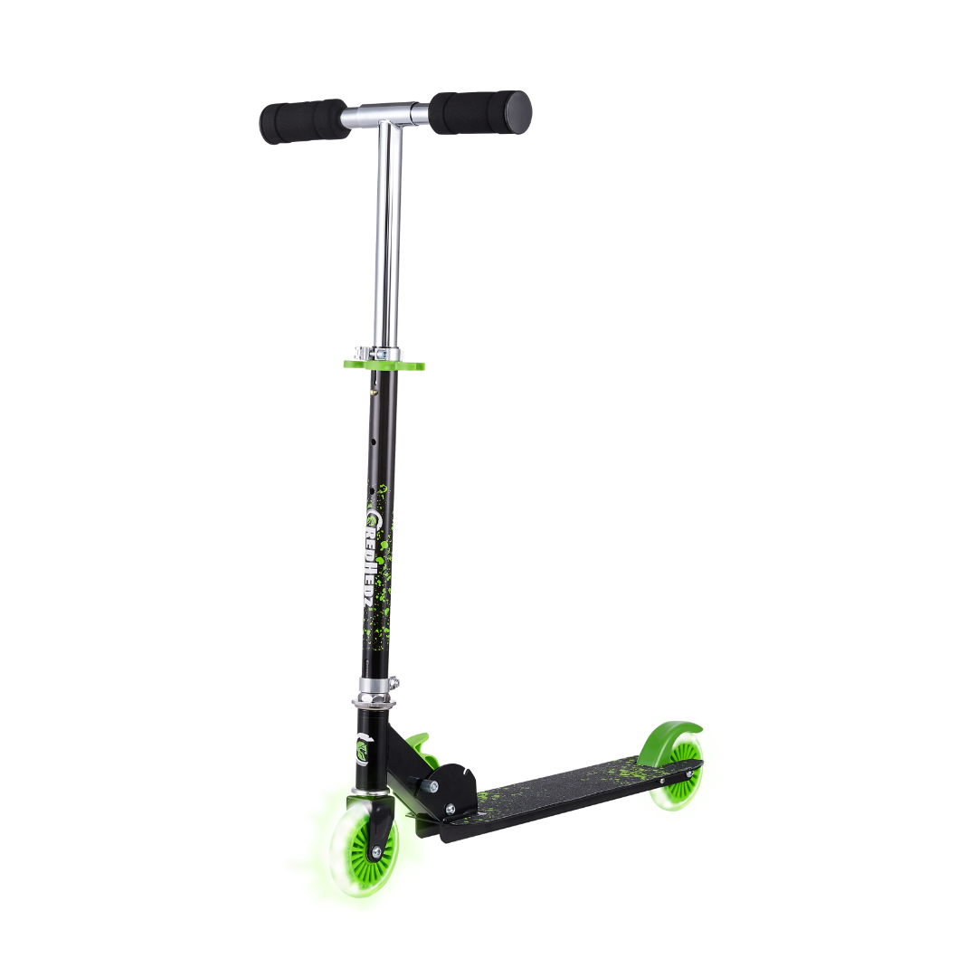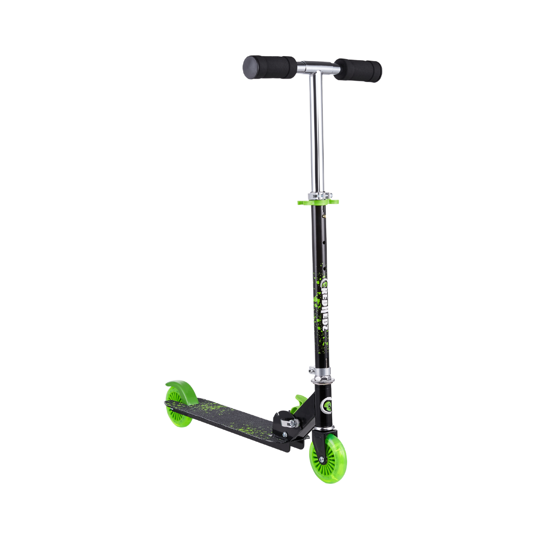 This CredHedz 2 Wheel Light up Wheel Scooter with Matching Abs Helmet and Protective Gear is perfect for tons of outdoor fun adventures. This female kick scooter is made out of a strong, light metal deck to keep it lightweight and sturdy for everyday use. It easily folds to a compact size that can fit in cars, trucks, or closets. With rubber grips for a comfortable grasp and a quick stop rear brake as an added layer of safety for those quick decisions. Comes with black and pink colored matching Helmet and Protective Gear