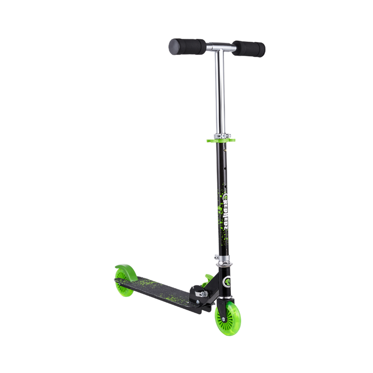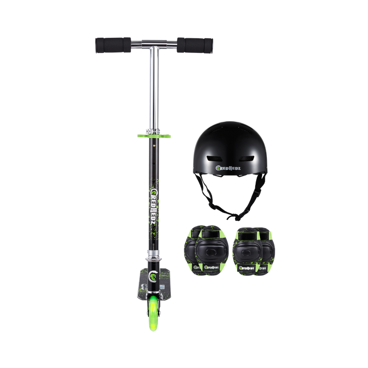 This CredHedz 2 Wheel Light up Wheel Scooter with Matching Abs Helmet and Protective Gear is perfect for tons of outdoor fun adventures. This female kick scooter is made out of a strong, light metal deck to keep it lightweight and sturdy for everyday use. It easily folds to a compact size that can fit in cars, trucks, or closets. With rubber grips for a comfortable grasp and a quick stop rear brake as an added layer of safety for those quick decisions. Comes with black and pink colored matching Helmet and Protective Gear