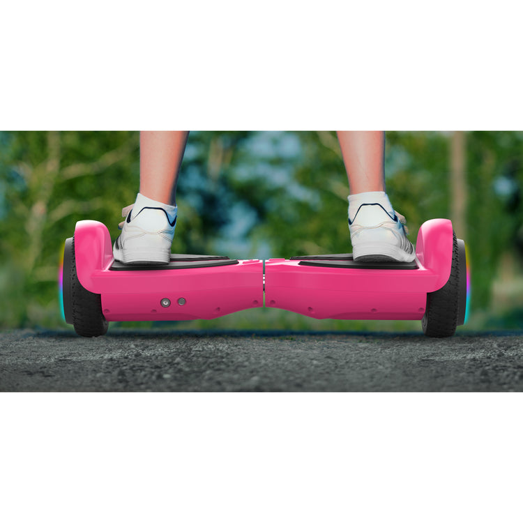 Take your hoverboard fun to the next level with the Voyager Star Glide Hoverboard with light-up and glitter effect wheels! The Star Glide features 6.5" tires to make it a breeze to navigate a smooth ride. Brighten up the streets with color changing wheels and a unique glitter effect. Catch wind with cruising speeds up to 5 mph and travel up to 3 miles per charge. The Star Glide Hoverboard weighs just 12 pounds and supports riders up to 130 pounds.